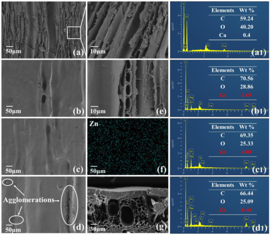 SEM micrographs of (a) dyed wood and (b) dyed wood treated with ZnO-0.5%, (c) treated with ZnO-1%, (d) treated with ZnO-2%; (e) dyed wood coated with carboxymethyl chitosan; (f) EDS mapping of (c) Zn; (g) cross-section of treated wood; the EDS spectra of (a1) image (a), (b1) image (b), (c1) image (c) and (d1) image (d).