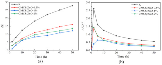 ∆E changes (a) and color variation rates (b) of untreated dyed wood (K) and treated wood (CMCS/ZnO-0.5%, CMCS/ZnO-1%, and CMCS/ZnO-2%) under 200–800 nm UV light irradiation.
