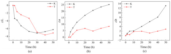 Figure 6a illustrates changes in the values of lightness (ΔL) for untreated and treated dyed wood. Both untreated and treated wood showed negative ∆L values after 50 h of exposure, –6.2 and –7.1, respectively. The sharp change in brightness of untreated wood occurred in the first two hours of irradiation, while that of treated wood was 20–30 h. Both displayed stable ∆L values after 30 h of irradiation. However, the pre-darkening of treated wood was much less than untreated wood. Changes in Δa and Δb for untreated and treated wood are shown in Figure 6b,c. The untreated wood showed severe darkening indicated by negative ∆L values, which, together, increased ∆a and Δb. The ∆a and ∆b values of untreated wood after 50 h irradiation were 25.2 and 13.1, respectively. However, the ∆a and ∆b values for treated wood were only 8.3 and 2.9.