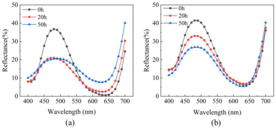 The surface color saturation of dyed wood is closely correlated with its reflectance properties. As shown in Figure 7, fluctuating spectral reflectance curves with increasing wavelength were observed in untreated and treated dyed wood, presented in a pattern of variation in the sine function. The spectral reflectance curves of both groups of specimens were shifted downward overall at the end of 50 h irradiation, reducing the color saturation. Thus, the surface darkened, and L significantly declined. According to the relationship between color and wavelength [42], the reflectance was high in the range of 450–525 nm for the two groups of samples, corresponding to the blue color. By comparing the spectral reflectance curves of untreated and treated dyed woods, the reflectance of untreated dyed wood rapidly decreased in the range of 450–525 nm during the first 20 h irradiation and slightly changed after 20 h until the end of irradiation. However, the reflectance of the treated dye wood gradually decreased after 20 h. The proportion of yellow and red in the reflectance spectra increased in accordance with the theory of color complementarity and the color wavelength connection [43], thus decreasing their complementary light blue and purple in the range of 450–500 nm. This result also shows that the untreated dyed wood tended to be red and yellowing, especially in the middle and final stages of irradiation, consistent with the changes in ∆a and ∆b above. However, the treated dyed wood performed quite well in the range of 450–500 nm with almost no change.