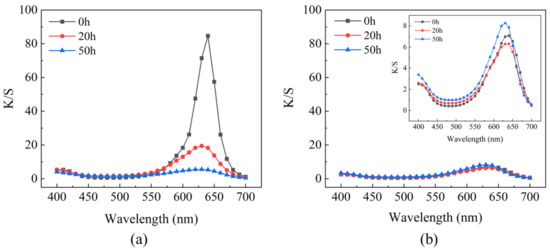 (a) K/S spectra of untreated dyed wood and (b) treated wood irradiated at 0, 20, and 50 h UV light.