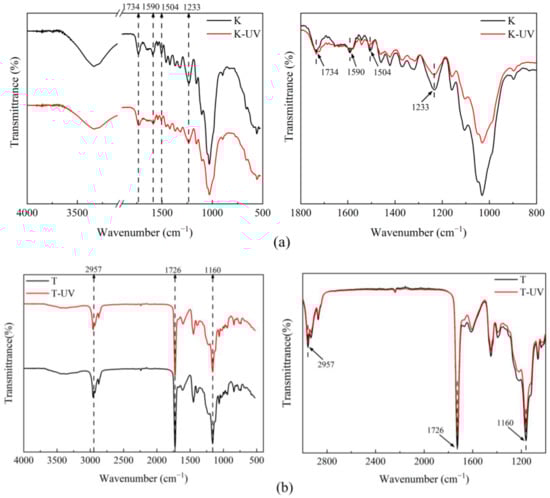 FTIR spectra of dyed wood (a) and treated wood (b) before and after UV irradiation.