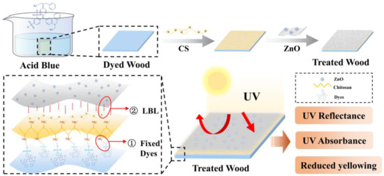 Chitosan solution was selected as the cationic coating of the LbL system. The 1wt% chitosan was dissolved in deionized water by adding acetic acid dropwise, stirred for 1 h until the chitosan was fully dissolved, and then sonicated for 30 min to form a clear solution. The nano-dispersion of ZnO was prepared by mixing anionic polyacrylamide and acrylic acid. After 1 h of continuous stirring at room temperature, the solution was sheared at 10 Krpm for 10 min in a high-shear emulsification machine. The resulting solution was used as the anionic coating of the LbL system. The dyed wood after LbL self-assembly was treated wood. Figure 10 shows the preparation process and mechanism of treated dyed woods.