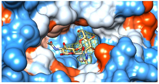 Surface view of the substrate-binding pocket of Pch-Dac with bound (GlcNAc)2. The color of the protein surface indicates the electrostatic charge: negative (red), positive (blue) and neutral (white). The Zn2+ ion is shown as a blue sphere. The bound substrate is drawn as sticks. The contours show the 2Fo-Fc electron density of the ligand, at 1σ level.