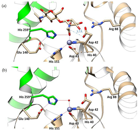 Details of (a) the substrate-binding site of Pch-Dac-lig structure with bound (GlcNAc)2 and (b) Pch-Dac structure with a single water molecule bound to Zn2+. The Zn2+ cation is drawn as a blue sphere; water is a small red sphere. Hydrogen bonds are marked with red dotted lines. The distance from Asp42 to the C atom of the scissile bond of the substrate is indicated by a blue dashed line. Asterisk (*) marks His259 that forms part of the substrate-binding site although it comes from a neighboring protein subunit. A comparison of the substrate-bound and unliganded structures shows that the presence of the substrate does not seem to make any significant change to the structure of the protein.