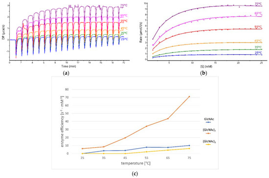 (a) The raw kinetic data obtained by ITC multiple injection method of measuring the kinetics of (GlcNAc)2 deacetylation at different temperatures. (b) The heat-flow levels after each injection of 2µL of 150 mM substrate, transformed into reaction rates and plotted against (GlcNAc)2 concentration; Michaelis-Menten equation was fitted to the obtained curves. (c) Graph of the dependence of enzyme efficiency on temperature for GlcNAc, (GlcNAc)2 and (GlcNAc)3 substrates.