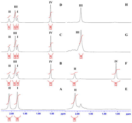 The analysis of the 1H and 13C NMR spectra of samples in buffer HEPES/D2O upon the reaction of (GlcNAc)2 with Pch-Dac revealed a mixture of the substrate and products. The complexity of the 1H and 13C NMR spectra of post-reaction samples meant that reliable analysis of reaction progress on the basis of NMR spectra was possible only up to a narrow range of resonances corresponding to the methyl of N-acetyl groups and the resulting CH3COOH (Figure 9 and Figure S6). Thus, two proton signals at 2.009 and 1.978 ppm corresponded to the methyl of N-acetyl groups of the non-reducing (II) and reducing ends (I) of the substrate, respectively, and two other signals at 1.980 and 1.848 ppm corresponded to the methyl (III) of N-acetyl groups of the product and methyl (IV) of CH3COOH, respectively (Figure 9). Therefore, these proton resonances were selected as reliable diagnostic signals for a quantitative estimate of the ratio of the substrate and products in the mixture. Moreover, a thorough inspection of the methyl region of 13C NMR spectra (Figure S6) i.e., 22.0–23.5 ppm yielded qualitative information on the composition of post-reaction samples that complete the observation provided by the 1H NMR spectra.