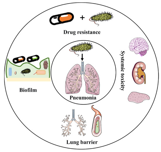 Local delivery of antibiotics can circumvent first-pass metabolism, minimize systemic side effects, decrease inactivation by metabolic enzymes, enhance drug bioavailability, and facilitate the initiation of therapeutic action [68,69,70]. Nevertheless, in the case of antibiotics used to treat bacterial pneumonia, local delivery of the drug to the lungs through the respiratory tract also faces multiple obstacles. In addition to the barrier challenges presented by cells, organelles, and bacterial biofilms, local drug delivery within the lung must overcome the biological barriers presented by structures and functions specific to the respiratory tract.