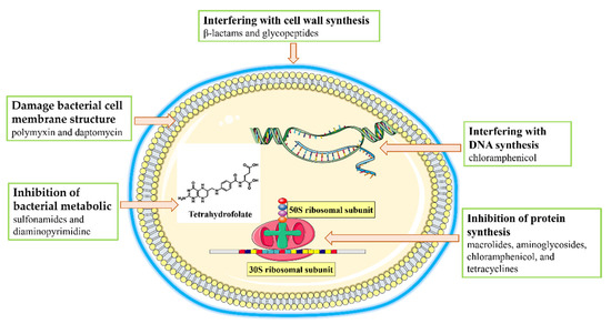 There are two main pathways by which antibiotics treat bacterial infections: inhibiting bacterial growth and direct killing of bacteria [13,14]. According to their main principle of action, antibiotics can be divided into five classes (Figure 3). These mechanisms of action include interfering with cell wall synthesis. This class of antibiotics kills bacteria by inhibiting mucopeptide synthetases and hindering the synthesis of the mucopeptides that form the structural basis of the cell wall, causing the swelling and lysis of bacteria [15]. This class of antibiotics includes β-lactams such as penicillin and glycopeptides [15,16]. A second mode of action involves the inhibition of protein synthesis. These antibiotics inhibit the growth of bacteria by binding to the ribosomal subunits responsible for bacterial protein synthesis. For example, the 30S subunit of the bacterial ribosome can be bound by macrolides, aminoglycosides, and tetracyclines to block protein synthesis [17,18]; similarly, chloramphenicol binds to and inhibits the 50S ribosomal subunit [30]. A third type of antibiotic works by interfering with DNA synthesis, such as the inhibition of the replication of bacterial DNA by ciprofloxacin, which alters the superhelix of DNA by binding to bacterial topoisomerases II and IV [19]. A fourth mechanism involves the inhibition of bacterial metabolic pathways. Tetrahydrofolate is required by many bacteria as a one-carbon unit donor [20]; sulfonamides and diaminopyrimidine antibiotics are inhibitors of this pathway [31]. Finally, some antibiotics damage the bacterial cell membrane [14]. For example, positively charged polymyxin and daptomycin interact with and destroy the negatively charged bacterial membrane [32].