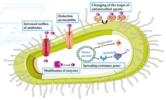In some cases, antibiotics can be rendered ineffective in killing or inhibiting the growth of bacteria through the development of resistance. There are four main mechanisms by which bacteria can exert drug resistance (Figure 4). The first mechanism involves modification by enzymes. Specifically, many antibiotics can be hydrolyzed and neutralized by bacterial enzymes. For example, β-lactamase enzymes disrupt the lactam structure of penicillins and cephalosporins, making them unable to inhibit target mucopeptide synthases [33,34]. Resistance can also be generated by a reduction of permeability or increased efflux of antibiotics. The intake of antibiotics can be reduced by the down-regulation of porin genes or structural modifications or loss of function of the porins that allow antibiotics to enter [13]. On the other hand, efflux of these molecules from bacterial cells can be increased by the up-regulation of active transporters [35]. Resistance can be affected by changes to the antimicrobial target. Accumulation of mutations can lead to the production of target molecules, such as proteins, that are no longer inhibited by the antibiotic. For example, mutation in target enzymes have been shown to cause bacteria to be resistant to quinolones [36]. Once a mechanism is established, it can be broadly disseminated by the spreading of resistance genes. Bacteria can transmit antimicrobial genes or plasmids to naturally susceptible bacteria through transformation [37], transduction [38], and direct contact [39] to facilitate the acquiring of resistance.