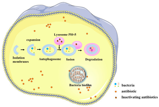 Barriers may also be presented by organelles and organellar membranes. Host cells may form phagosomes via the phagophore in order to recognize and bind to bacteria as a defense mechanism. These structures bind to lysosomes to form autolysosomes that may kill the bacteria [60]. However, some bacteria have evolved immune escape mechanisms that can inhibit the bactericidal effects of autolysosomes [61]; these bacteria can survive and even reproduce in phagosomes and phagolysosomes [62]. This bacterial defense mechanism further protects these bacteria from antibiotics, as some antimicrobial compounds do not readily enter the organelles. For example, clarithromycin has been shown to be excluded by the phagosome where bacteria often reside [63]. Moreover, even if the antibiotic enters the organelle, its activity may be impaired in the acidic environment of the lysosome [59].