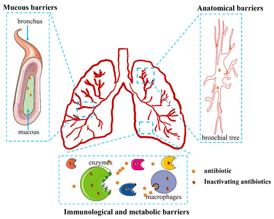 Targeted delivery to the lungs requires overcoming three main known barriers. One type of barrier is known as an anatomical barrier. The lungs have a complex bronchial tree lined with ciliary cells that exert pulmonary mucociliary clearance to remove particles deposited in the airways. These functions create a mechanical barrier that inhibits pulmonary drug delivery [71]. A second type of barrier involves the mucous barrier. Respiratory mucus covering the airways from the nose to the fine bronchial tubes allows the capture and removal of foreign bodies, including xenobiotic compounds such as antibiotic agents [71]. In addition, the mucous barrier works synergistically with anatomical barriers, and lung mechanical barriers become more effective due to airway stenosis caused by inflammation and mucus hypersecretion [71]. Immunological and metabolic barriers also influence drug delivery. Since the function of the lungs is to participate in the exchange of air with the outside world, they face a complex external environment; therefore, the lung forms a strong barrier consisting of chemical and immune defenses. The chemical and immune barriers to drug delivery in the lungs consist of proteolytic enzymes, surfactants, and alveolar macrophages [72]. Proteolytic enzymes, including endopeptidase and cathepsin H, can hydrolyze and thus inactivate drugs [72]. Many macrophages are also present in the alveoli, and alveolar phagocytes can engulf and remove particles that reach the alveoli. Chemical surfactants augment these functions by preventing inhaled particles from adhering to the epithelial surface of the lung and facilitating their removal by macrophages [73,74]. It is clear, then, that effective pulmonary inhalation drug delivery requires overcoming formidable barriers (Figure 6).