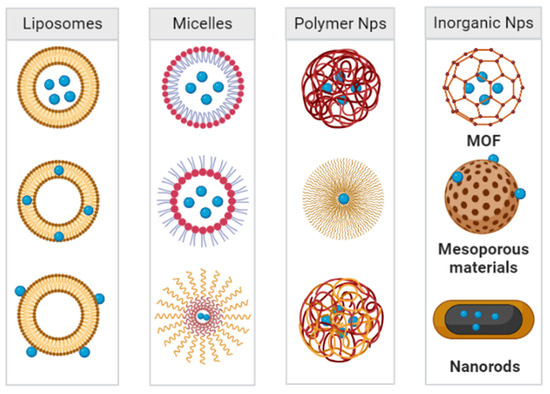Various bioactive nanoparticles have shown potential as carriers for pneumonia treatments. The timing and concentration of therapeutic drug accumulation at the site of infection are critical to the effective treatment of pneumonia [84]. Among many bioactive nanoparticle systems applied for the treatment of bacterial lung infections, polymeric nanoparticles are one of the most commonly used nanoagents. For example, nanoparticles based on poly (lactic-co-glycolic acid) (PLGA) have been employed to effectively treat pneumonia, and their key advantages lie in their non-toxicity and biodegradability. In addition, polyethylene glycol (PEG) is another commonly used material for carriers for lung drug delivery systems [85]. To this point, several such materials have been approved by the Food and Drug Administration (FDA) as carriers for drug delivery systems, including PLGA and chitosan. In addition to polymer nanoparticles, liposomes, micelles, and inorganic nanoparticles (e.g., gold nanoparticles, iron nanoparticles, and quantum dots) have also been applied as antibiotics carriers. These particles have large areas that can be modified with functional moieties, including targeting molecules and environmentally responsive moieties (Figure 7). Research regarding these and other micellar, inorganic, and metallic materials is currently identifying more effective nanomaterials for antimicrobial therapy in the lung [86].