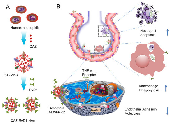 (A) shows the generation of neutrophil membrane-derived nanovesicles (NVs) co-loaded with RvD1 and Ceftazidime (CAZ). (B) The nanovesicles home to the infectious lung deliver both RvD1 and CAZ. RvD1 binds to GPCRs (ALX/FPR2), inhibiting the NF-κB pathway to decrease the expression of cell adhesion molecules, and mitigating neutrophil tissue infiltration and increasing the phagocytosis. Simultaneously, CAZ inhibits bacterial growth in the lung. Modified and reproduced with permission from the Spring [98].