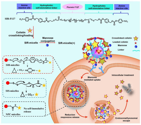 Schematic illustration of the treatment of intracellular bacterial infections using SIR-micelles(+). SIR-F127 has three moieties: pristine F127 used for conjugation scaffold and micelle formation; hydrophobic and self-immolative moiety used for cell penetration and traceless drug release; amine active moiety used for colistin or mannose crosslinking and conjugation. SIR-micelles(+) can be easily generated by adding colistin and mannose successively in SIR-F127 aqueous solution. Modified and reproduced with permission from the Elsevier [107].