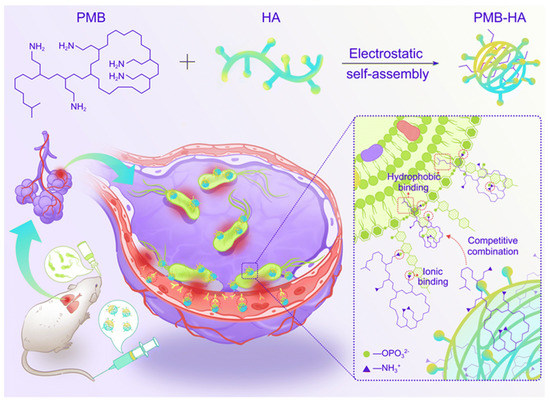 Other similar studies have shown that electrostatic assembly of polymyxins with polyanionic materials leads to good results. The targeted-release properties of the drug imparted by the polymeric material could be a general approach to improve other highly toxic antibiotics [114]. Zhang et al. produced polymer nanoparticles through self-assembly of negatively charged hyaluronic acid (HA) with positively charged PMB molecules (Figure 10). After intravenous injection, the nanoparticles were found to aggregate in the infected area of the lung due to the targeting of HA to CD44 receptors overexpressed on endothelial cells in the inflammatory state. Due to the antibacterial activity of PMB in which it binds to the phosphate group of lipopolysaccharides (LPS) in the bacterial outer membrane, the drug in PMB-HA nanoparticles is competitively released upon the encountering of bacteria. Furthermore, by reducing the positive charge of PMB, PMB-HA nanoparticles reduce cellular damage as well as histological toxicity, thus improving cellular and biological safety. This intelligent delivery system provides a new approach for the resurrection of PMB in the treatment of bacterial inflammatory diseases [115].