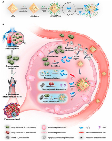 Schematic illustration showing the working principles of nFMs@Amp to treat hydrogen peroxide (H2O2)-secreting Streptococcus pneumoniae (S. pneumoniae) infection. (A) Schematic diagram of the synthesis steps of nFMs@Amp. (B) Schematic diagram of the process of Streptococcus pneumoniae causing lung infection in mice and the mechanism of action of nFMs@Amp in eliminating H2O2 from the lungs of infected mice. Modified and reproduced with permission from the Elsevier [129].