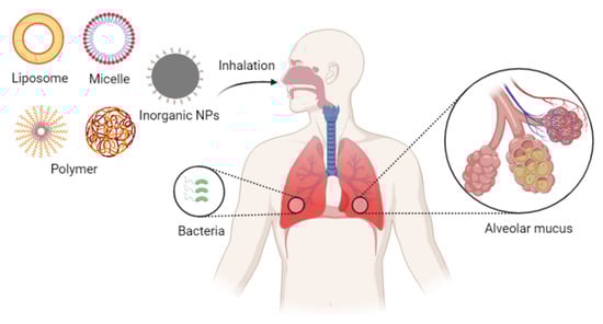 Polymeric nanoparticles have been widely applied in studies of lung infections. There are multiple types of polymers that can associate with different drug molecules and that are biocompatible, highly functional, and exhibit low toxicity. Recent studies have shown that nanoparticles consisting of polymer-loaded antibiotics greatly reduce the toxicity of the drug but retain antibacterial activity. These nanoparticles have especially been applied to the reintroduction of older antibiotics into the clinic. For example, polymyxin B (PMB) is effective against multidrug-resistant Gram-negative bacteria, but their nephrotoxicity and neurotoxicity limit the doses that can be administered. However, a recent study using polymer-delivered mucin showed good efficacy [113]. Here, the authors modified PMB with 2,3-dimethylmaleic anhydride and grafted oligomeric chitosan to prepare polyionic nanocomplexes. The polymers shielded the positive charge of PMB by electrostatic interactions, reducing the side effects of the drug but retaining its antimicrobial activity.