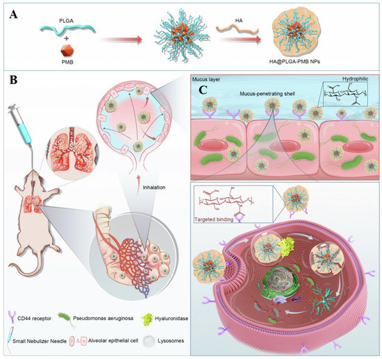 The pulmonary barrier limits the scope of antibiotic applications for pulmonary inhalation delivery. Most antibiotics cannot be delivered directly to the lungs due to their inherent limitations, such as high hydrophobicity and poor cellular absorption [143]. The introduction of nanomaterials has greatly improved the efficiency of pulmonary drug delivery and significantly reduced drug toxicity. Among the common lung delivery vehicles, PLGA-related polymers have been used to carry several types of drugs, such as proteins, peptides, DNA, and siRNA. Casciaro et al. delivered PLGA-encapsulated antimicrobial peptides via a liquid injector to a mouse model of pneumonia. The PLGA nanoparticles inhibited bacterial growth, leading to a reduction in lung bacterial load [144]. PLGA nanoparticles have also been used to aid drug penetration through the mucus barrier and improve the efficiency of pulmonary drug delivery. Wu et al. constructed nanoparticles of hydrophilic HA with PLGA containing PMB to enable better penetration of the drug through the mucus barrier (Figure 13). The modification of PLGA improved the drug delivery efficiency and promoted the slow release of the drug for sustained treatment [145].