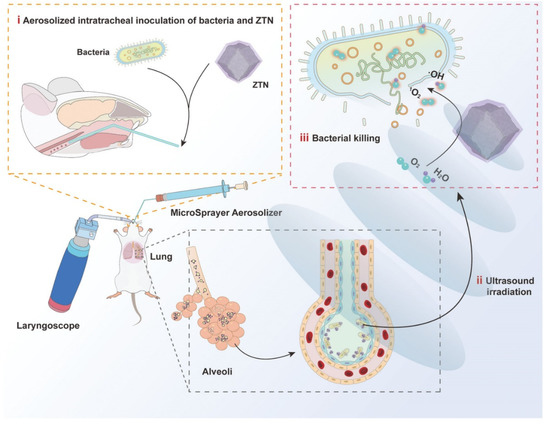 With the development of nanotechnology, inhalation therapy combined with various treatments, such as phototherapy and sonodynamic therapy (SDT), has been found to effectively remove bacteria and avoid antibiotic resistance. Due to the strong tissue penetration of ultrasound, SDT has potential applications in the treatment of deep tissue diseases. The use of ultrasound to activate acoustic sensitizers to produce different reactive oxygen species leads to a strong antibacterial effect. In a recent study, metal-organic framework-derived nanoparticles were designed to be used in inhaled treatments of bacterial pneumonia. ZIF-8 was incorporated into these nanoparticles as an acoustic sensitizer to generate bactericidal reactive oxygen species upon sonodynamic therapy [148]. Similarly, upon nebulized intratracheal inoculation, nanoparticles constructed of ZrTi2O6 have been found to aggregate in the infected areas of the lung. In addition, after ultrasound irradiation in vitro, this material produces reactive oxygen species that kill Gram-negative multidrug-resistant bacteria. This inhaled SDT has great potential as a replacement for antibiotic treatment of drug-resistant bacterial pneumonia (Figure 14).