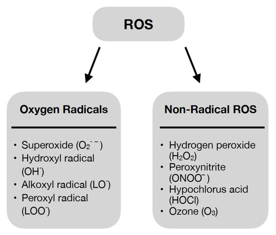ROS are highly reactive derivatives of molecular oxygen. They owe their properties to an unpaired electron on the valence shell [24]; however, the role of ROS is not limited to destructive action against cellular components [24,25]. They have been shown to be involved in physiological processes of the body in small amounts [24,27]. ROS also have functions in regulating the signaling pathways responsible for many cellular processes such as proliferation and survival—involving mitogen-activated protein kinase (MAPK) or apoptosis and ageing—involving p66 Src homology/collagen (Shc) [25]. Thus, the profile of the effect of ROS on the organism—negative or positive—is dependent on its concentration [24]. ROS can be divided into oxygen radicals and non-radical ROS, as shown in Figure 2 [27].