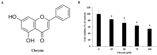(A) The chemical structure of chrysin. (B) Chrysin reduces the viability of MC-3 oral cancer cells. The results are presented as the means and standard deviation of three independent samples. Statistical differences were determined by the Dunnett’s t-test: * p < 0.05, compared with the control.