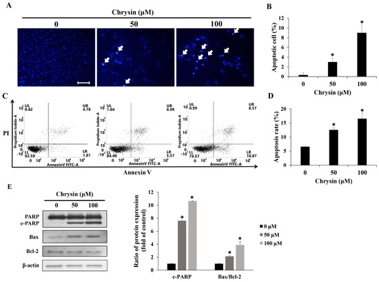 Chrysin induces apoptosis in MC-3 oral cancer cells. (A) Fluorescence microscopy image of cell morphology (scale bar = 10 μm) after chrysin treatment. The arrows indicate chromatin condensation in MC-3 cells. (B) The bar graph representing the average number of 4′,6-diamidino-2-phenylindole-positive cells as a percentage of all cells. (C) Cells stained with annexin V-propidium iodide and analyzed using flow cytometry. (D) Bar graph representing the percentage of cells in apoptosis among all cells. (E) The levels of the apoptosis-related proteins poly (ADP-ribose) polymerase, Bax, and B-cell lymphoma-2 (Bcl-2). Quantification was performed using Image J. The results are presented as the means and standard deviation of three independent samples. The statistical differences were determined by the Dunnett’s t-test: * p < 0.05, compared with the control.