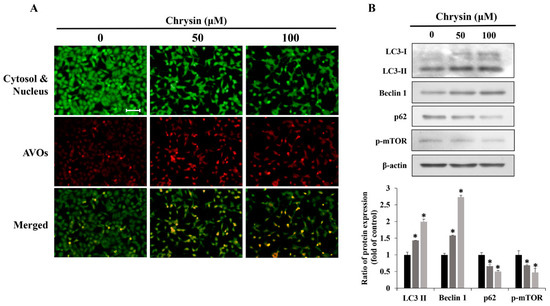 Acidic vesicular organelles, a morphological feature of autophagy, were analyzed via acridine orange staining. MC-3 cells were seeded in a 60 mm dish at a density of 2 × 105 cells/mL for 24 h. Next, the cells were treated with chrysin (0, 50, and 100 µM) for another 24 h. Afterwards, all media containing chrysin were removed, and the cells were washed with PBS three times. The cells were then fixed with 4% formaldehyde for 15 min. In order to remove the formaldehyde, the cells were washed with PBS three times. Finally, after treatment with acridine orange solution (5 µg/mL, 10 min), the cells were observed under a fluorescence microscope at 200× magnification.