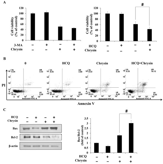 Chrysin induces cell protective autophagy in MC-3 oral cancer cells. (A) Viability of cells pre-treated with 3-methyladenine and hydroxychloroquine (HCQ) and subsequently treated with chrysin. (B) Apoptosis rates of cells pre-treated with HCQ and subsequently treated with chrysin. (C) The level of apoptosis-related proteins Bax and Bcl-2. Quantification was performed using Image J. The results are presented as the means and standard deviation of three independent samples. The statistical differences were determined by the Dunnett’s t-test: # p < 0.05, compared with the chrysin treatment group.