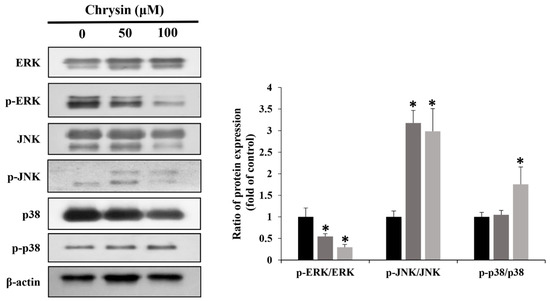 Chrysin induces apoptosis through mitogen-activated protein kinases [extracellular signal-regulated kinase (ERK), stress-activated protein kinase, and p38] in MC-3 oral cancer cells. Quantification was performed using Image J. The results are presented as the means and standard deviation of three independent samples. The statistical differences were determined by the Dunnett’s t-test: * p < 0.05, compared with the control.