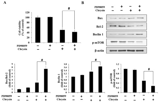 Chrysin induces autophagy through the ERK/mTOR pathway in MC-3 oral cancer cells. (A) The viability of cells pre-treated with PD98059 (an ERK inhibitor) and subsequently treated with chrysin. (B) The levels of the apoptosis- and autophagy-related proteins Bax, Bcl-2, Beclin-1, and p-mTOR. Quantification was performed using Image J. The results are presented as the means and standard deviation of three independent samples. The statistical differences were determined by the Dunnett’s t-test: # p < 0.05, compared with the chrysin treatment group.