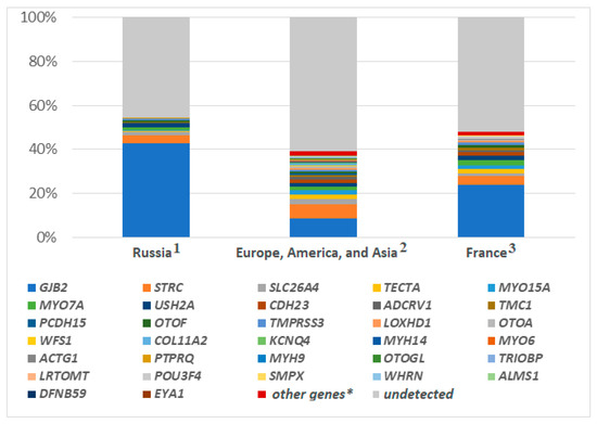 Shatokhina, O.; Galeeva, N.; Stepanova, A.; Markova, T.; Lalayants, M.; Alekseeva, N.; Tavarkiladze, G.; Markova, T.; Bessonova, L.; Petukhova, M.; et al. Spectrum of Genes for Non-GJB2-Related Non-Syndromic Hearing Loss in the Russian Population Revealed by a Targeted Deafness Gene Panel. Int. J. Mol. Sci. 2022, 23, 15748. https://doi.org/10.3390/ijms232415748