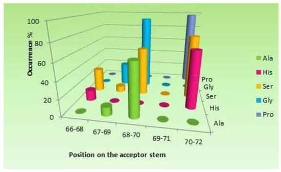 tRNA molecules are principal components of the modern translation system, where genetic codes, embedded in mRNA strands, are turned into proteins. Canonical tRNAs have a four-armed cloverleaf secondary structure and an L-shaped tertiary structure (Figure 1a,b). The anticodon (AC) loop carries three nucleotides (positions 34–36) that fully characterize the amino acid esterified to the 3′ end tail. The tRNA molecule therefore possesses the unique capacity of mediating between the mRNA, accommodated on the small ribosomal subunit, and the Peptidyl Transferase Center (PTC), the active site of the large ribosomal subunit, where its cognate amino acid joins the nascent polypeptide. Twenty tRNAs are specifically associated with the 20 canonical amino acids. Their aminoacylation is accomplished by their cognate synthetases, which acquire the identity of the tRNA mainly from the anticodon triplet [1], but also from additional recognition elements classified as ‘‘determinants’’ and ‘‘anti-determinants’’ [2], such as the variable loop of tRNASer, the discriminator base (N73), and a few nucleotides at defined positions in the acceptor stem [3,4,5]. Nucleotides contained within the first five base pairs from the acceptor stem of certain amino acids were demonstrated to carry sufficient coding information to confer specific aminoacylation, and minihelices derived from these acceptor stems were specifically charged by their cognate synthetases [4,5]. These stem identity determinants, also termed “operational code” [4], were suggested to be remnants of a primordial mechanism for specific aminoacylation of proto-tRNAs [4,6], whereby the initial synthetase, assumed to have had a limited size, could have reached coding information in the stem, adjacent to the 3′ end [4,7,8]. Recently, large scale statistical analysis of sequences from the acceptor-TΨC stem [9], revealed that almost all the stem identity determinants found in the bacterial tRNAs of Ala, Gly, His, Pro, and Ser are contained within their cognate coding triplets, which are extremely conserved in positions 68–70 and 70–72 (Figure 2). These coding triplets, same as the “operational code”, were proposed to be a relic from a prebiotic aminoacylation mode, but one that was controlled by the full stem coding triplets, rather than merely by the discrete identity determinants. Their high evolutionary preservation was attributed to their role as recognition elements in the aminoacylation mode utilized by the modern corresponding synthetases [9] which belong to class IIa [10].