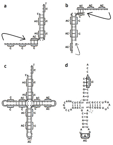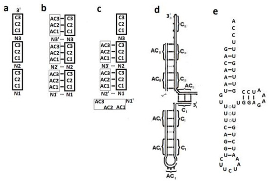 Assembling a proto-tRNA from three codon-only strands and their fully complementary replicates, i.e., three AC-only strands that have a nonspecific nucleotide at their 3′ instead of at the 5′, would have also led to a 4-arm model of 72 nucleotides that retains considerable equivalence to the modern cloverleaf secondary structure. However, the AC triplet in the anticodon loop will be off center (as occurs in Figure 4c) and one of the two “snap fasteners”, i.e., the base pair between nucleotides 10 and 25, which is engaged in assembling the final 4-arm model (Figure 1a and Figure 5c,d), will be lost, thus reducing the analogy to the modern tRNA.