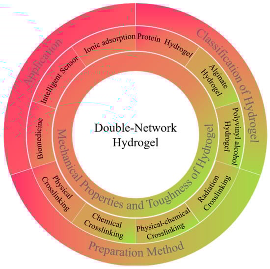 Up to now, there have been a variety of cross-linking methods (such as physical cross-linking, chemical cross-linking, physical–chemical cross-linking, radiation cross-linking, etc.) to prepare DN hydrogels. This review introduces the preparation methods of different hydrogels, the differences in mechanical properties, and the preparation of the mainstream hydrogel material (such as poly (vinyl alcohol) (PVA) and sodium alginate (SA) and proteins) in improving the mechanical properties, the progress in the research, and finally, lists the double network hydrogels in different fields of application, as shown in Figure 1.