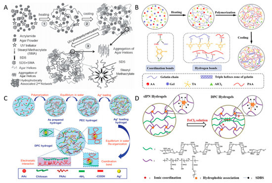 Physically cross-linking hydrogels are sensitive to external changes. In the process of cross-linking, the formation of reversible hydrogen bonds can cause the hydrogel to have good self-healing properties after damage. Chen [] synthesized the fully physically cross-linking Agar/hydrophobic associated polyacrylamide (HPAAm) hydrogel using the one-pot method (Figure 2A). The experiment proved that introducing HPAAm in the second network improved the mechanical properties of the hydrogel by dissipating energy. The unique physical cross-linking reversible network structure in the hydrogel causes the hydrogel to have excellent self-healing properties. Bai [] prepared a four-element DN physical cross-linking hydrogel using Gelatin (Gel), acrylic acid (AA), tannic acid (TA), and aluminum chloride (AlCl3), and the preparation mechanism is shown in Figure 2B. The first network was prepared with free radical polymerization of acrylic acid. The second network was formed using triple helical bundles stabilized by hydrogen bonds in the state of hydrogel freezing and permeated with the first network to finally form GATA (Gel, AA, TA, AlCl3) hydrogel. Due to the formation of reversible hydrogen bonds and coordination bonds, the maximum tensile strength of the hydrogel can reach 216 KPa, and the 3 h self-healing efficiency can be 88.4% at 60 °C.