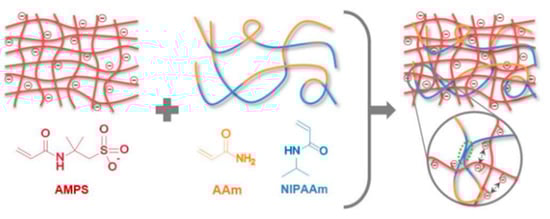 PAMPS/P(NiPAAm-Co-AAM) DN hydrogel cross-linking process. Reprinted with permission from []. 2019, American Chemical Society.