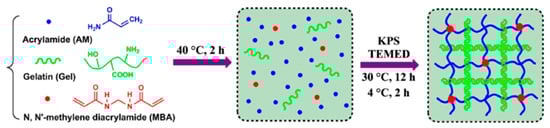 Preparation mechanism of polyacrylamide/gelatin (PAM-gel) hydrogel Reprinted with permission from []. 2021, Elsevier.