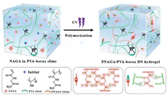 In 1999, researchers proposed preparing hydrogels using radiation cross-linking. In forming hydrogels, ionizing radiation does not need to add any initiator, cross-linking agent, etc. Because of the participation of radiation technology, hydrogel preparation and sterilization can be carried out at the same time, which avoids the generation of toxic substances []. Salmawi [] used radiation-induced cross-linking to prepare PVA/CS hydrogel, which has an excellent ability to resist microorganisms when applied to wound dressings. Still, the prepared blend is fragile and has poor toughness. To improve the performance of hydrogels after irradiation, Guo [] immersed PVA/CS hydrogels in tannic acid (TA) solution to prepare PVA-based double cross-linking composite hydrogels, including physical cross-linking between PVA, CS, and TA and chemical cross-linking induced by gamma radiation. Compared with PVA hydrogels prepared by pure radiation, the tensile strength and elongation at the break of the composite hydrogels prepared by the double network mechanism were significantly improved. In recent studies, Ma [] prepared double cross-linked DN hydrogels based on UV-initiated in situ polymerization of N-acryloyl glycinamide (NAGA) in PVA/borax mucilage, as shown in Figure 5. Under UV irradiation, NAGA underwent in situ polymerization, and a double network was constructed between poly(N-acryloyl glycinamide) (PNAGA) chains and PVA molecules through hydrogen bonding interactions and dynamic boronic acid bonding. The dynamic double network and effective energy dissipation, especially the gels with a high content of PNAGA, have high mechanical strength, high toughness and fatigue resistance, and the combination of dynamic boronic acid bonding and hydrogen bonding gives the gels good self-healing properties. Chen [] prepared high-strength PVA/N,N-Dimethyl-N-(3-methacrylamidopropyl)-N-(3-sulfopropyl) ammonium betaine (MPDSAH) hydrogel, combining UV irradiation cross-linking and the freezing–thawing method. With the increase in MPDSAH content and irradiation time, the tensile properties of hydrogel with a 15% concentration of MPDSAH increased more than twice compared with a 0% concentration. Moreover, the structure and properties of the hydrogel became more stable due to the blending of MPDSAH and PVA, and the friction coefficient was reduced by 50%. The wear was minor in the friction experiment.