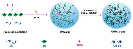 Alginate (Alg) is a kind of natural polymer consisting of β-1, 4-D-mannan acid (M) and α-1, 4-L-glucuronic acid (G), and owing to its good biocompatibility, is widely used in medical and food fields. Alginate is easy to dissolve into hydrogel with Ca2+, and Ca2+ is easy to combine with other 2-valent cations in the G region, which also provides a way to solve the problem of poor mechanical properties of hydrogels. In the PAM/Alg system, complete cross-linking of PAM before ion exchange of Alg will lead to poor solvent exchange, and the two polymers will produce micron-scale aggregation. After the water absorption process, hydrogen bonding and metal–ligand coordination stabilize the newly formed alginate aggregates, resulting in a large-scale cross-linking zone. It is helpful to improve the mechanical properties of hydrogels []. Zhao [] found that the hydrogen bond interaction in SA/PAM hydrogel promoted SA self-assembly in the porous matrix of PAM, and the layered semi-interpenetrating network structure also improved the mechanical properties of the hydrogel. Zhang [] used radiation technology and Cu2+ cross-linking to prepare polyacrylamide/copper alginate (PAM/Cu-Alg) double-network hydrogel (Figure 6) to analyze and study the alginate concentration, Cu2+ concentration, and irradiation absorbed dose. The ionic interaction between Alg and Cu2+ and the hydrogen bond between PAM chains dissipate a large amount of energy, so the degree of Alg cross-linking with Cu2+ has a significant influence on the mechanical properties of the hydrogel, and the conductivity of the hydrogel will also be improved because of the addition of Cu2+. In addition, research has pointed out that without the addition of SA into polyethylene glycol (PEG) (meth), acrylate hydrogel for specific mechanical properties showed a poor state, from 0% to 2% when the content of the SA was added, and hydrogel compression modulus, strength, failure strain, and toughness had an apparent rising trend. Thus, the SA network to join, combined with the covalent network of PEG (meth) acrylate, the performance of the hydrogel improved to a certain extent [].