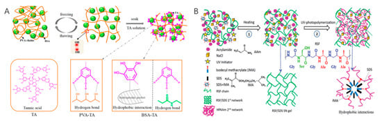 (A) Preparation mechanism of TA-PVA/BSA hydrogel Reprinted with permission from []. 2018, American Chemical Society; (B) Preparation mechanism of RSF/HPAAm hydrogel Reprinted with permission from []. 2019, Royal Society of Chemistry.