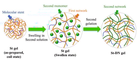 Preparation mechanism of St DN hydrogel. Reprinted with permission from []. 2021, Royal Society of Chemistry.