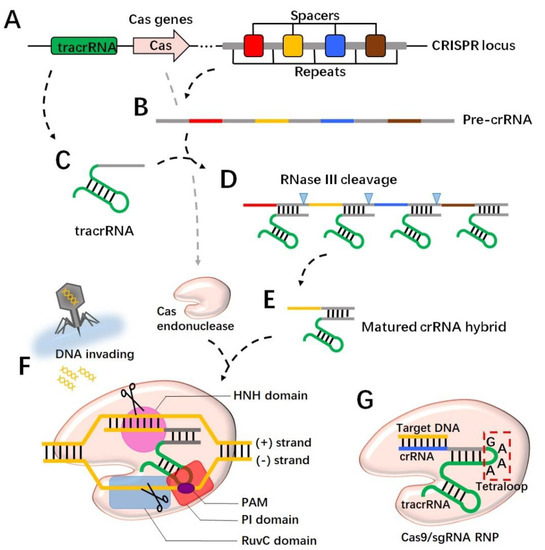 CRISPR is a family of DNA sequences integrated into the genomes of a range of bacteria and archaea. As an immunological memory storage system, the sequences direct the synthesis of various non-coding RNA transcripts, and, together with Cas protein, build immunoprotection for most prokaryotic organisms [17]. A CRISPR locus consists of repeated sequences (30–40 bp in length) with variable numbers, which are separated by ~20 bp-sized spacers (Figure 1A) [18,19]. Spacers are derived from previously infected bacteriophages, and their variety and numbers are constantly being updated along with new viral attacks [17,18,20]. To acquire CRISPR-mediated immunity, foreign genome DNA is firstly digested into fragments and then inserted with the assistance of the Cas1-Cas2 complex as a spacer in between the CRISPR repeated regions [18,21]. When a new invasion is taking place, the CRISPR system immediately responds to direct the synthesis of RNA transcripts known as pre-crRNAs, which are comprised of spacer sequences and partially repeated regions (Figure 1B). Meanwhile, trans-activating CRISPR RNA (tracrRNA) is transcribed from a distinct locus that is also comprised of partially repeated sequences (Figure 1C). The pre-crRNA hybridizes with the tracrRNA transcript through the complementary base pairs within the repeated regions (Figure 1D). The binding with tracrRNA is essential for pre-crRNA maturation, in which the ribonuclease III (RNase III) engages and trims the duplex for the crRNA hybrid formation (Figure 1E) [22,23]. Next, the spacer region in the crRNA hybrid identifies the target and recruits Cas endonuclease to double-cut the foreign DNA strands, resulting in a disruption to DNA invasion (Figure 1F) [22,23,24]. In addition to crRNA targeting, a further requirement for the Cas/RNA complex’s cleaving of the DNA is the presence of a short conserved sequence named the protospacer adjacent motif (PAM) on the DNA to be severed [25]. The PAM is generally located downstream of the crRNA-binding region and serves as a binding site to the PAM-interacting (PI) domain of Cas9 [26]. The PAM interaction triggers Cas9 catalytic activity for DNA unwinding [27,28], and then the HNH domain and the RuvC domain on Cas9 respectively cleave the (+) strand and the (−) strand, where the (+) strand refers to the one complementary to the crRNA (Figure 1F) [25,29]. Specifically, the cut site occurs three or four nucleotides upstream of the PAM [25]. Of note, specific Cas variants recognize different sequences of PAMs. For instance, S. pyogenes Cas9 (spCas9) binds the “NGG” motif, while Staphylococcus aureus Cas9 (saCas9) tends to bind the “NNGRRT” motif [30,31]. There are several types of CRISPR/Cas systems found in nature with distinctions in RNA structures and Cas protein variations. Class 1, which includes types I, III, and IV, is characterized by a multi-subunit Cas complex for DNA cleavage. In contrast, the class 2 system, including types II, V, and VI, has an endonuclease module with a single-protein effector, which is more feasible for engineering [21,32,33]. Specifically, Cas9, as a single-chain endonuclease in the type II system, has been extensively studied to expand the genome toolkit [25,34].