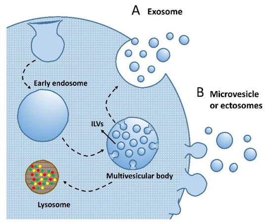 Routes of EV biogenesis. (A) Exosome biogenesis depends on the cellular endomembrane system, with the plasma membrane invaginating to form endosomes. Endosomes further mature to multivesicular bodies with intraluminal vesicles (ILVs) enclosed. The multivesicular bodies either go to lysosomes for degradation or fuse to the cell membrane for exosome release. (B) Microvesicles or ectosomes directly bud from the cell surface. Both generation machineries may give vesicles with a variable size distribution.