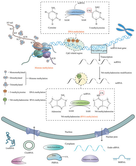 DNA methylation of the ncRNA host gene, m6A modification of ncRNA, and chromatin regulation by histone modifications. DNA methylation refers to a kind of methylation modification on DNA, which is under the action of DNA methyltransferase, S-adenosyl methionine (SAM) acts as a methyl donor to covalently add a methyl group at the cytosine 5 carbon position of the CpG dinucleotide in the genome, and SAM is transformed into SAH (S-adenosylhomocysteine). N6-methyladenosine is a type of RNA methylation modification which is the m6A methyltransferase that adds a methyl group to the N6 position of adenosine, converting SAM to SAH. Histones are the core components of the nucleosome subunits in which histones H3, H4, H2A, and H2B form an octamer surrounded by DNA fragments. Histone methylation is a covalent modification that usually occurs on H3 and H4 lysine residues, which can be monomethylated, dimethylated, even trimethylated. K4, K9, K27, K36, and K79 of H3 and K20 of histone H4 are common sites of histone lysine methylation. These catalytic processes are reversible, and the red box represents the added methyl group. The ncRNAs undergoing chromatin modification, DNA methylation modification, and m6A modification, are transferred from the nucleus to the cytoplasm through the nuclear pores, and then form mature ncRNAs in the cytoplasm. The mature ncRNAs can regulate the protein expression levels of methylation modifiers in the cytoplasm and can also enter the nucleus through the nuclear pore to regulate the function of methylation modifiers.