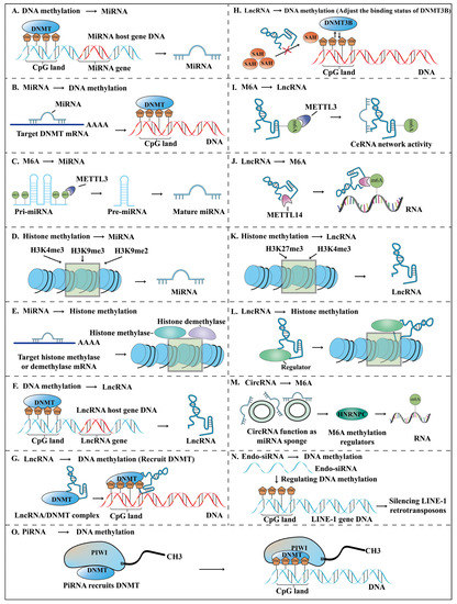 The summary of the interaction between ncRNAs and methylation modifications in BC. (A) Regulation of miRNA by DNA methylation. (B) Regulation of DNA methylation by miRNA. (C) Crosstalk between m6A and miRNA. (D) Regulation of miRNA by histone methylation. (E) Regulation of histone methylation by miRNA. (F) Regulation of lncRNA by DNA methylation. (G). Regulation of DNA methylation by lncRNA (lncRNA recruits DNMTs). (H) Regulation of DNA methylation by lncRNA (lncRNA regulates the binding status of DNMTs). (I) m6A modification on lncRNA. (J) lncRNA regulates m6A RNA methylation. (K) Regulation of lncRNA by histone methylation. (L) Regulation of histone methylation by lncRNA. (M) CircRNA indirectly regulates m6A modification. (N) Regulation of DNA methylation by endo-siRNA. (O) Regulation of DNA methylation by piRNA.