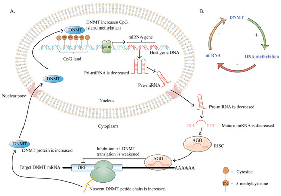 DNA methylation is maintained and established by members of the DNMT family, DNMT1, DNMT3A, and DNMT3B [73]. DNMT acts on the CpG island of the miRNA host gene promoter to regulate methylation status, thereby affecting miRNA expression. In turn, miRNAs can target binding to DNMT mRNA, silencing DNMTs mRNA at the post-transcriptional level and subsequent DNMT protein synthesis reduction [55] (Figure 2B). Obviously, the methylation state of the miRNA host gene promoter is regulated by DNMT, and miRNAs can target and negatively regulate the expression of DNMT, which can form a miRNA/DNMT regulatory circuit involved in the initiation and development of BC (Figure 3). Pang et al. demonstrated that hypermethylation of the promoter CpG island mediated by DNMT3A represses miR-200b, and miR-200b can negatively regulate DNMT3A expression, thus forming a feedback loop in triple-negative BC [57]. It is significant to note that miRNAs targeting DNMT is performed in the cytoplasm while the DNA methylation modification of miRNA host genes by DNMT is performed in the nucleus (Figure 3).