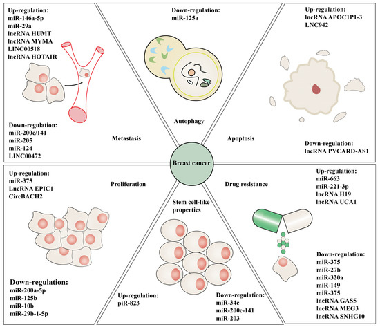 MiRNA, lncRNA, circRNA, and piRNA are associated with proliferation, apoptosis, metastasis, autophagy, stemness, and drug resistance in BC. Dysregulation of ncRNAs due to aberrant crosstalk between methylation modification and ncRNAs is associated with malignant behavior in BC, such as proliferation (miR-375, lncRNA EPIC1, circBACH2. miR-200a-5p, miR-125b, miR-10b, miR-29b-1-5p), apoptosis (lncRNA APOC1P1-3, LNC942. lncRNA PYCARD-AS1), metastasis (miR-146a-5p, miR-29a, lncRNA HUMT, lncRNA MYMA, LINC00518, and lncRNA HOTAIR. miR-200c/141, miR-205, miR-124, and LINC00472), autophagy (miR-125a), stemness (piR-823, miR-34c, miR-200c-141, and miR-203), and drug resistance (miR-663, miR-221-3p, lncRNA H19, lncRNA UCA1. miR-375, miR-27b, miR-320a, miR-149, miR-375, lncRNA GAS5, lncRNA MEG3, lncRNA SNHG10).