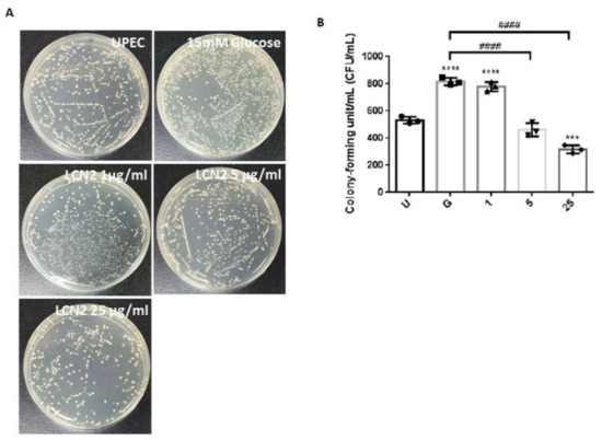 LCN2 suppression of UPEC infections in bladder cells in a high-glucose environment. SV-HUC-1 cells were first pretreated with 15 mM glucose, followed by treatments with different concentrations of LCN2 (1, 5, and 25 μg/mL) for 24 h and infection with pGFP-UPEC (MOI of 1:100) for 4 h, as described in the text. The definitions of the letters on the X axis: U, UPEC infection alone; G, with 15 mM glucose pretreatment alone. UPEC infections in bladder cells were examined by plating cells on NB agar (A) and were determined using ImageJ software (B). Colony-forming units/mL (CFUs/mL) were acquired after plating out lysed solutions of infected cells. The picture shown is representative of a typical result. The data are expressed as the means SDs of three independent experiments. An analysis of variance was used to evaluate differences between various treatment groups and controls. Statistical differences between groups were determined using the Mann–Whitney U Student’s t-test. Statistical significance was set at p < 0.05. *** p < 0.001, **** p < 0.0001 compared to the positive control groups. #### p < 0.0001 for comparisons between two groups.