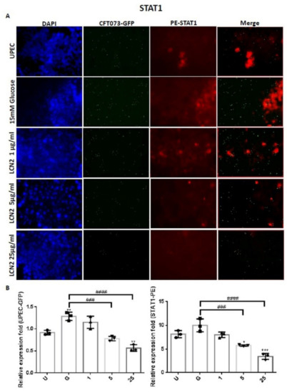 LCN2 decreased UPEC infections and STAT1 expression in bladder cells. SV-HUC-1 cells were first pretreated with 15 mM glucose, followed by treatment with different concentrations of LCN2 (1, 5, and 25 μg/mL) for 24 h and infection with pGFP-UPEC (MOI of 1:100) for 4 h, as described in the text. The definitions of the letters on the X axis: U, UPEC infection alone; G, with 15 mM glucose pretreatment alone. GFP-UPEC and PE-STAT1 expression in SV-HUC-1 cells, for 4 h postinfection, were (A) observed by fluorescence microscopy and (B) measured using ImageJ software. Cells infected with UPEC alone were used as a positive control. The pictures shown are representative of typical results. DAPI was used to count the number of cells and as a standard for calculating the fluorescence expression ratios of cells. Cell images were captured using a microscope (Leica) at 100× magnification. The data are expressed as means ± SDs from three separate experiments. An analysis of variance was used to evaluate differences between various treatment groups and controls. Statistical differences between groups were determined using the Mann–Whitney U Student’s t-test. Statistical significance was set at * p < 0.05. ** p < 0.01, *** p < 0.001 compared to the positive control groups. ### p < 0.001, #### p < 0.0001 for comparisons between two groups.